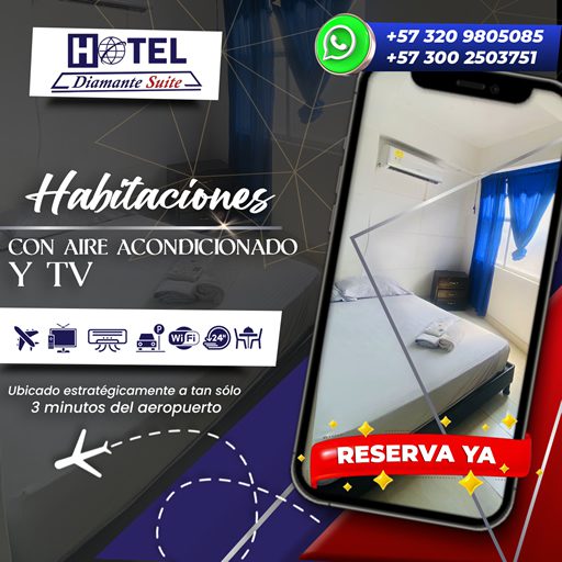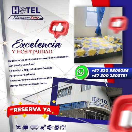 📍 Ubicación Privilegiada a tan sólo 3 minutos del aeropuerto de la ciudad de Cúcuta: y cerca de las principales vías de acceso, *Hotel Diamante Suite* ofrece comodidad, conectividad y facilidad de movilidad para todos nuestros huéspedes, habitaciones con capacidad de hasta 5 personas completas con tv, aire acondicionado o ventilador.
