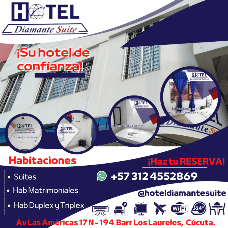 Estamos ubicados: Av Las Américas # 17 N - 194 Los Laureles - Cúcuta, Norte Santander. ¡Atención las 24 horas! ¡RESERVE AHORA! Teléfonos: +573124552869 / (607) 5947102 Correo: hoteldiamantesuite@gmail.com