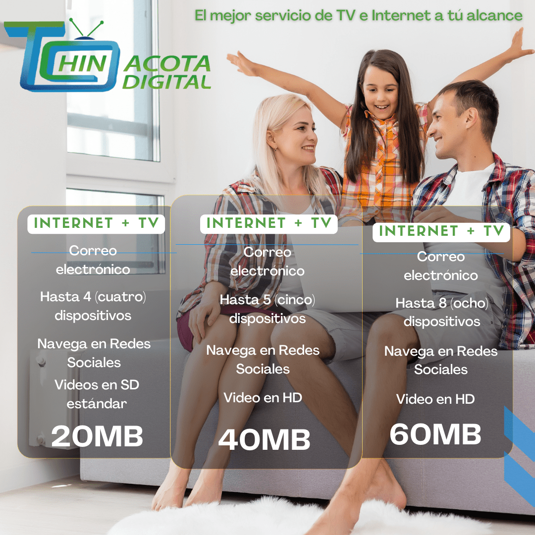 Internet + TV; 40 Mb: Correo Electrónico. cinco dispositivos, Navega en Redes Sociales, Video en HD.